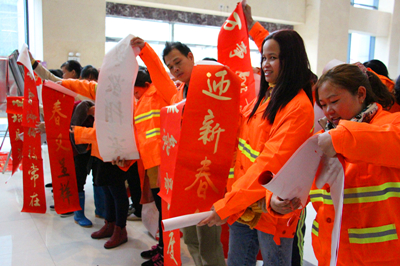 “春满人间百花吐艳 福临小院四季常安” “一帆风顺年年好 万事如意步步高” ……1月26日至28日,丽汇大厦一楼热闹非凡,为了感激社会各界对开云(kaiyun中国)官方网站的关心与支持,由开云(kaiyun中国)官方网站工会组织的书法家“迎新春 送祝福”义务送春联活动吸引了大量前来求墨宝的社会各界人士。三位南宁市书法协会的书法家以及南宁科巨公司副总经理陆章发为观众们现场挥毫,一幅幅金烫烫、散发着墨香的春联映衬着人们的笑脸,整个现场弥漫着浓浓的年味,短短三天时间便送出了2000多副春联。1月26日上午,开云(kaiyun中国)官方网站工会还启动了派送春联仪式,开云(kaiyun中国)官方网站工会主席黄丽琴带领工会人员将春联送到经开区40余位保洁人员、园林绿化工人、公司职工的手上。(张彩秀/文、图)