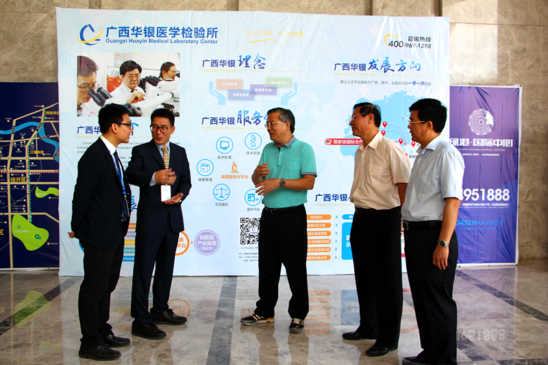 当天下午,周红波一行首先来到位于绿港·国际中心B4栋的广西华银医学检测所,听取了广西华银医学检测所相关负责人的企业生产经营情况汇报,走访该所广西医学检验中心、广西转化医学研究中心、东盟国际远程病理诊断中心,实地了解实验室建设运营情况。广西华银医学检测所于2016年1月进驻绿港·国际中心,以4500平米实验室作为广西总部基地,业务范围辐射广西、云南及东盟各国,总投资规模近1亿元,引入全国第一条完整的微生物全自动流水线,建设了国内第一家东盟远程病理诊断中心以及全国最大规模的精准医学实验中心。
