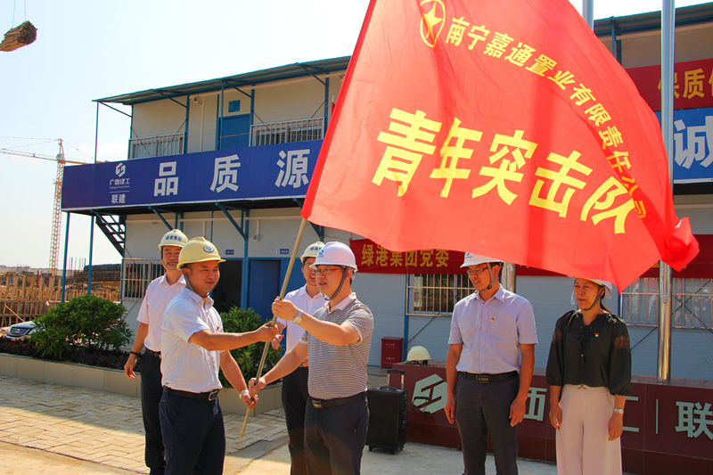 在授旗仪式中,集团党委书记、董事长、总经理龚国强对南宁科技产业园项目人员前期所做出的工作给予了充分肯定,赞扬了党员先锋队员、青年突击队员和工人朋友们为项目建设所付出的艰苦和努力,当前项目进展取得了较好的成绩。自8月12日南宁科技产业园项目正式开工以来,嘉通公司党支部带领工人们日夜苦干,千方百计克服恶劣的台风天气等不利因素,在短短的2个月时间便完成1#楼厂房一层的搭设模板,2#、3#楼回填基础土方,4#楼防水保护层浇筑以及9#宿舍楼基础承台浇筑等工作,充分展现了绿港铁军风采。下一步,希望全体党员先锋队、青年突击队队员们以此次授旗为契机,继续发扬绿港铁军精神,创先争优,攻坚克难,加快推进项目建设,确保项目如期建成交付。
