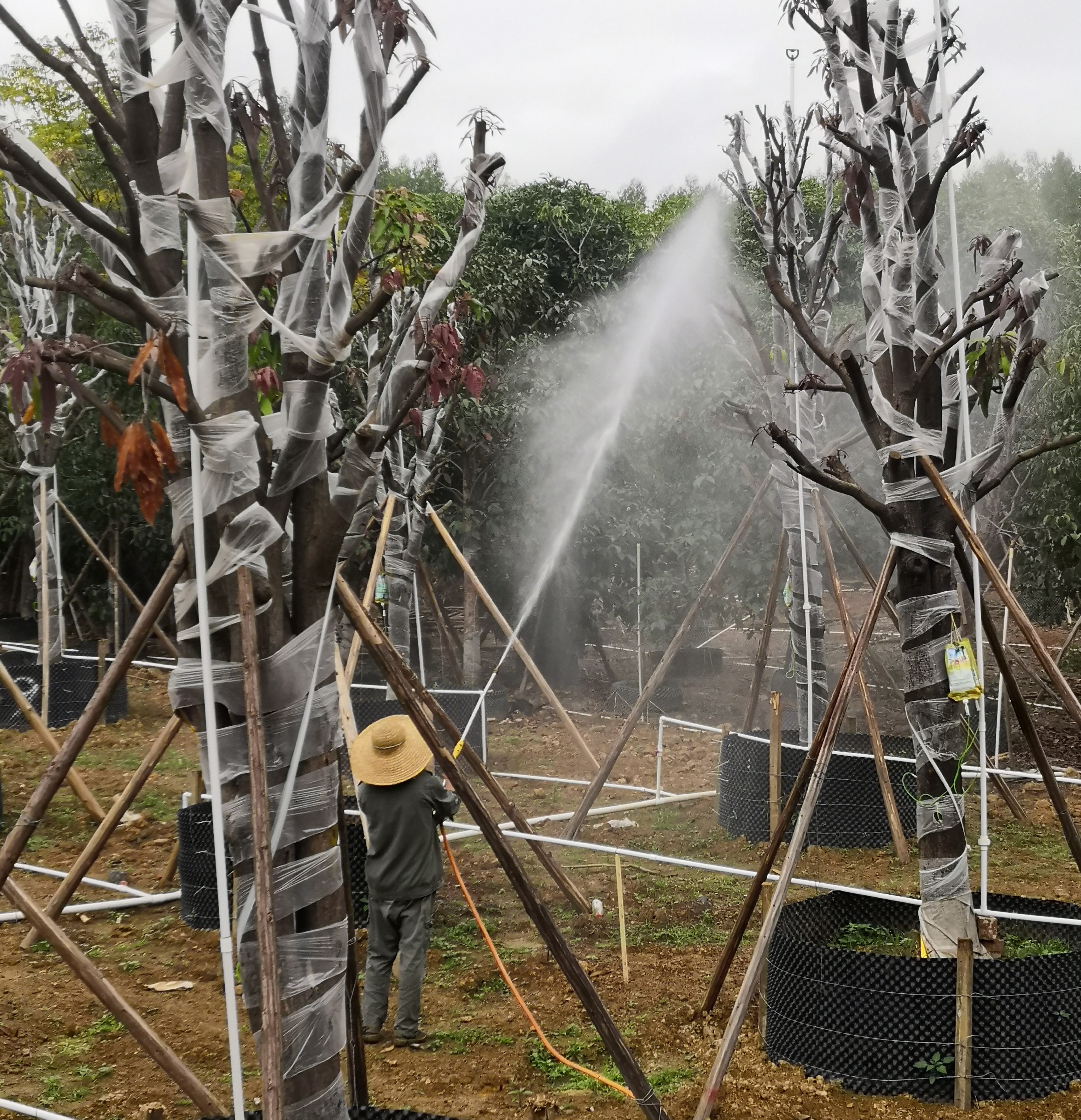 针对影响扁桃移植存活率的主要原因,QC小组具体采取了以下措施:一是保留扁桃骨架,确保树形完整,截枝时一次性垂直切割并处理好伤口;二是采用保水保温性薄膜,间隔性覆盖扁桃80%的主要躯干,预留部分区域确保透气性;三是在高温多雨季节加大“高效氯氰菊酯”等预防性药物的喷洒量和喷洒次数,并做好病虫害的监控和动态防治;四是种植前对场地进行尿素及复合肥的喷施和翻耕,种植后施放生根剂,并持续对扁桃温湿度、土壤PH值进行实施监测,适时追肥,调节土壤至偏酸性。