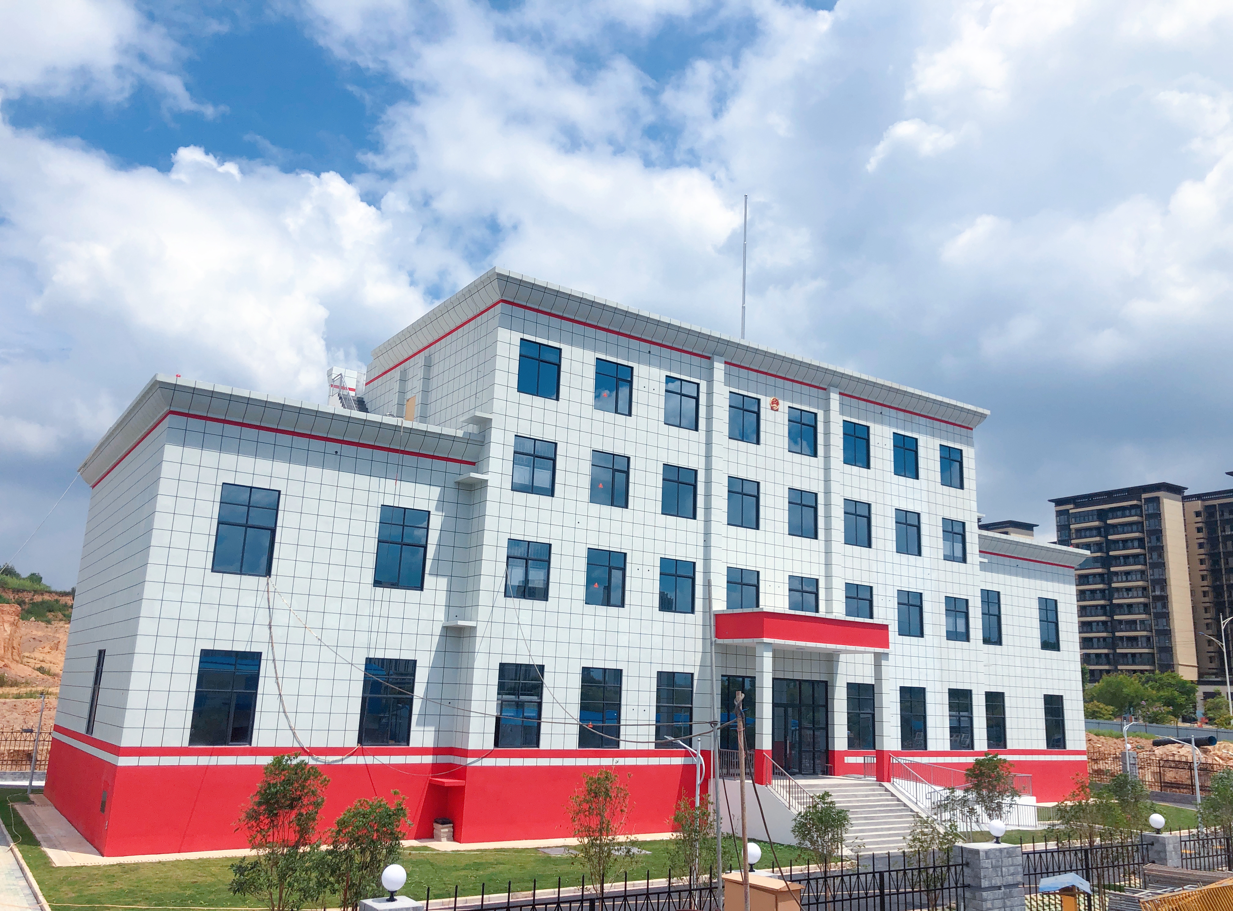 吴圩法庭回建工程是吴圩片区配套民生项目,为南宁经济技术开发区2022年城建计划重点实施项目。项目位于吴圩镇光明路西侧、6号路北侧,占地面积约8亩,总建筑面积3486.54㎡。主要建设内容为建设法院大楼,主要用于审批和办公;建设辅助用房,主要用于员工食堂及附属设施;总平配套工程等。项目自开工建设以来,科巨公司充分发挥建设铁军精神,积极协调各方攻克项目场地受限、变更手续繁复、资金紧缺、疫情影响、雨季施工等诸多困难;狠抓项目现场施工质量、安全文明施工管理、进度计划控制等主要工作,督促各参建单位加大人力、物力投入,全力以赴抓质量、抢进度、保安全,掀起整个项目现场建设的高潮,最终提前40天顺利完工,于8月6日顺利通过竣工验收。该项目布局规整,建筑风格稳重庄严,体现法院的执法公正的特性,建成后将提升吴圩法庭的办公及服务环境,提高办公效率,为吴圩人民群众提供更好的法律服务场所和更优质的司法服务。